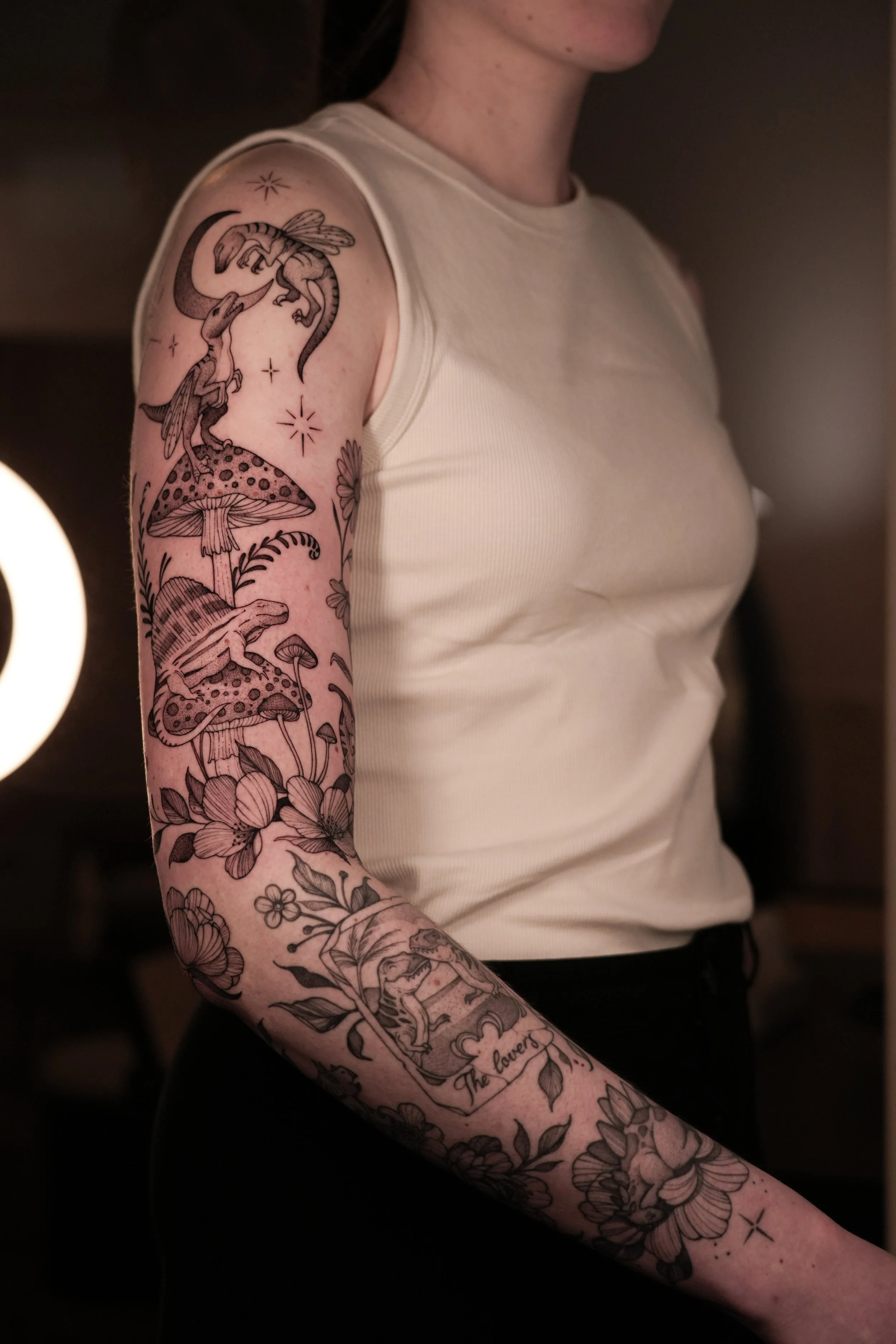 I don't tattoo certain areas such as ribs or feet and my favorite areas to work on are in order of preference arms (including hands), legs and upper back.